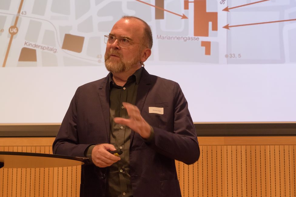 Den Abschluss bildete der Vortrag von Architekt Dietmar Feistel von Delugan Meissl Associate Architects als Vertreter/Repräsentant der ARGE Delugan Meissl Associated Architects und Architektur Consult, die als Generalplaner für den MCM verantwortlich zeichnet.